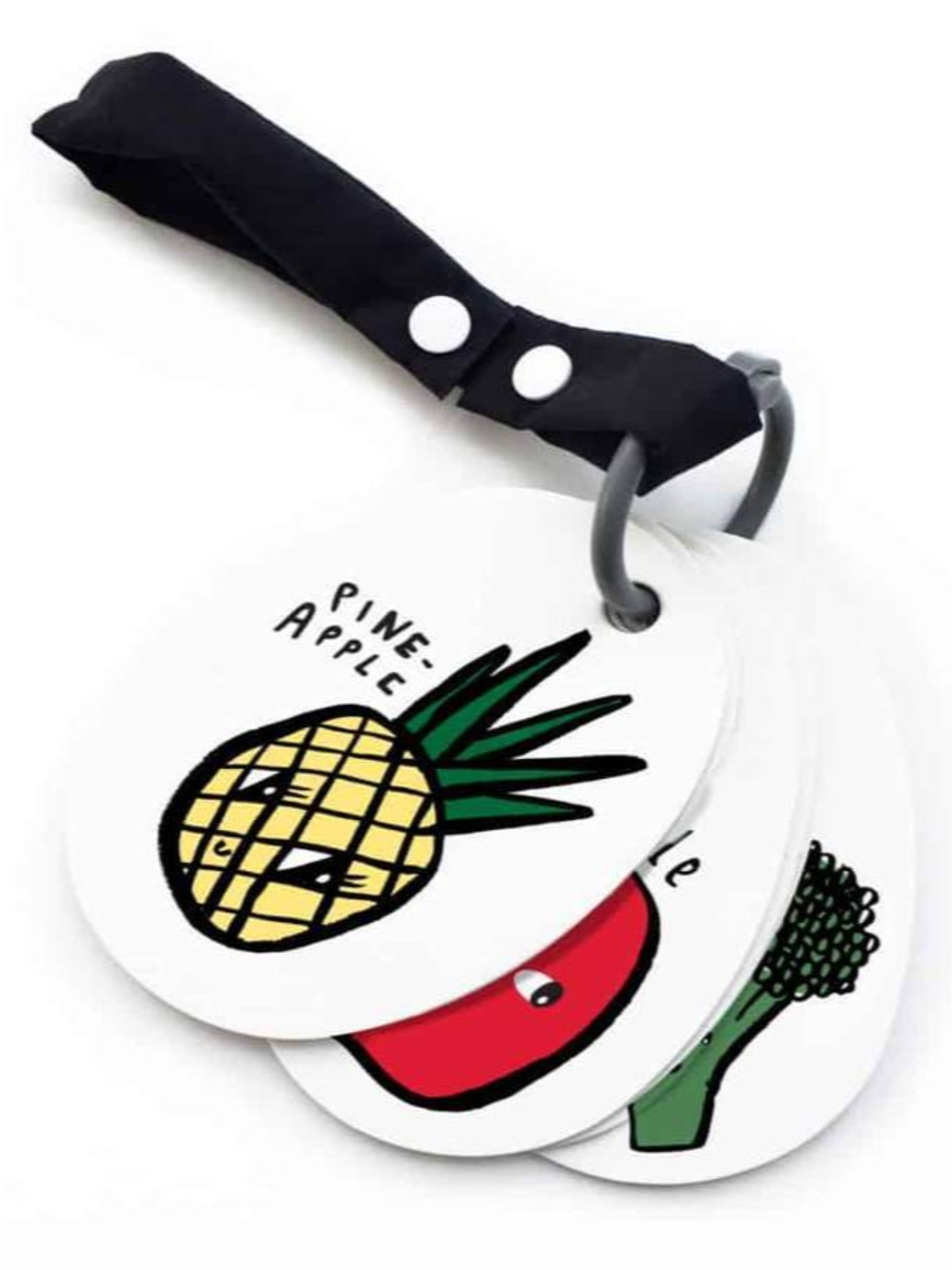 - Held together with a ring and strap that connects to your stroller or bag