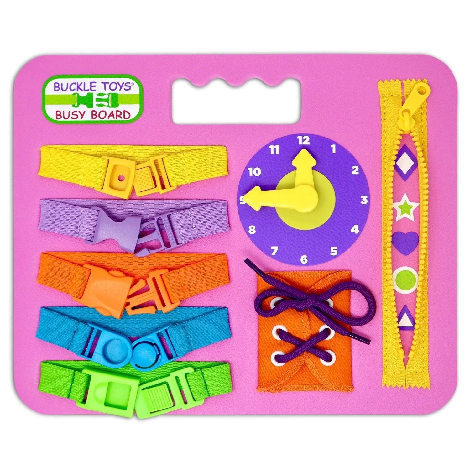 Keep your little learner engaged at home and on-the-go. This Busy Board is made with soft, lightweight foam and a built-in handle that's just right for toddler-sized hands to grip and hold. Each of the five colorful buckles has a different clasp style, and the zipper reveals hidden shapes inside. They'll love learning to read time with the clicking clock and practice tying shoelaces like a big kid!