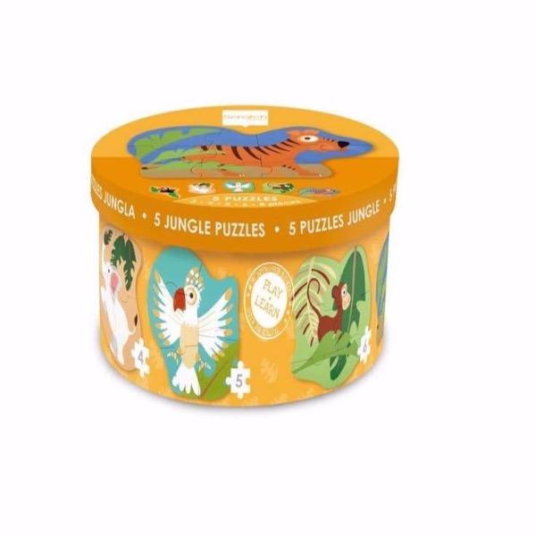 Scratch Starter Puzzles includes 5 puzzles with increasing piece counts designed for little hands. The varying complexity and irregular piece shapes help little ones develop spatial reasoning skills and fine motor skills as they assemble adorable jungle animals. The set includes the following: