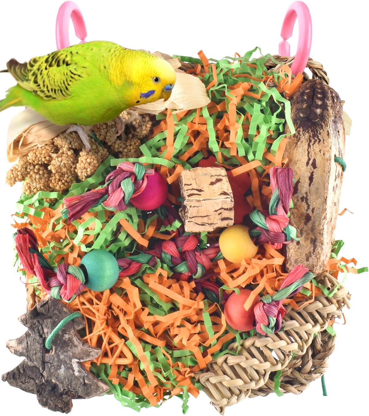 SAFE MATERIAL: KATUMO bird climbing mat is made of natural seagrass, decorated with colorful chew toys from natural wood block, wood chip, shredded paper, millet treat, corn husk, walnut and rattan, your bird will surely loving to chew and play